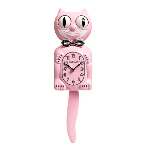 Klockan har en mjuk retro-rosa finish med blank glans och detaljer i krom, både på flugan och visarna. De silverfärgade siffrorna och tassarna framhävs vackert mot den rosa urtavlan. Som alltid har klockan Kit-Cats karakteristiska ögonrörelse och svängande svans.